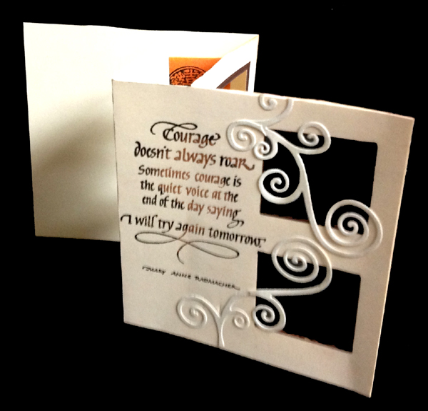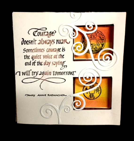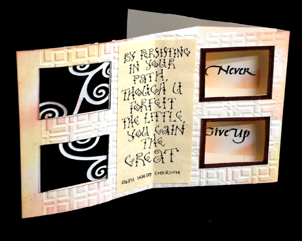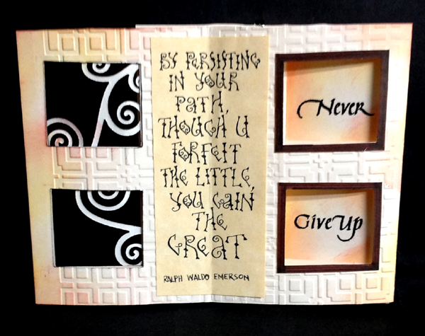 I used a cream toned cardstock one piece cut to 6.25 x 4.75"h and my other piece 11" x 4.75"h. Scored the 1st piece at 4.5". The 2nd piece at 3 1/8" and then again at 3 1/8" from the first score line. Cut my two windows in my 1st piece then matched up the cut outs onto my 2nd piece of cardstock, matching edges etc. and cut them. I used a Sizzix Movers & Shapers Peek a Boo Window die #654948. Cut a stencil of the rectangles to use for sponging the design on the inside layer of my 2nd piece. Sponged using Distress "Mustard Seed" & "Barn Door". Then stamped the Oriental Coins (Local king Rubber "Chinese Legends" & Rubber Trouble "Asian Set") using Versafine Black onyx. Embossed using Cuttlebug "Mandarin Screen" from the Asian Bundle set. Cut out window frames and colored the edges with a brown Zig Writer. Sponged some of the yellow and red lightly around the edges. Wrote a quote with a pointed pen, Sumi Ink on gold parchment paper in my Fickle font style. "By persisting in your path, though u forfeit the little, you gain the great. Ralph Waldo Emerson. Stamped the quote using Versafine Vintage Sepia and touching here and there on the stamp with the black, then clear embossing. Used the stencil from before and lightly sponged with the yellow and red. Then stamped the companion stamp in the two windows with the black, cleaning the stamp between stamping. Adhered the 1st part to the 2nd part matching the right edge. Then adhered a couple flourish die cuts (Impression Obsession) from the cream cardstock.