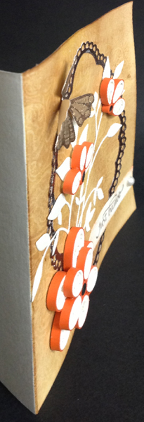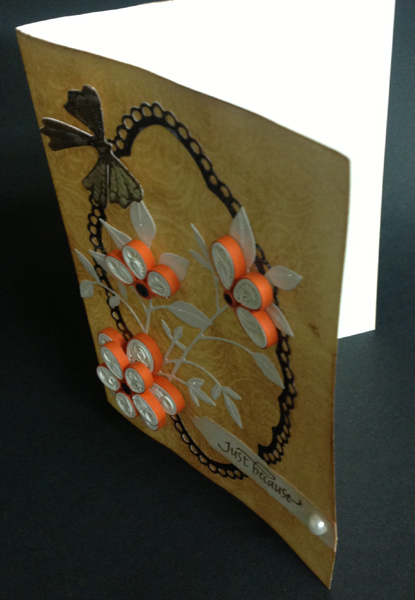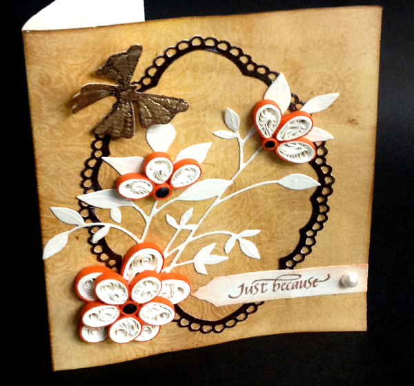 So I ran a piece of waxed paper through my machine using the cuttlebug "Musical Flourish" embossing folder. Then I sandwiched the waxed paper between two pieces of cream toned cardstock and ran through my machine again, which transferred the wax design to the cardstock. Sponged Distress Mustard Seed all over and wiped off excess with a damp tissue. Then sponged Vintage Photo lightly all over which picked up the design. Die cut the oval frame (Marianne Designs), then direct to paper with a Versafine Vintage Sepia pad and embossed with brown embossing powder. Adhered to card Die cut one of my newest leafy dies (Memory Box "Fresh Foliage) from cream cardstock and adhered to card. Quilled my elements, double layering the main flower and adhered to card. Stamped the sentiment onto a drop out piece from my Memory Box "Gothic Luminary" die using the brown and clear embossed. Sponged a touch of Dried marigold and adhered to card adding a large half pearl. As a final touch added the butterfly from my stash and added glitter vein details on the leaves using a Quickie Glue pen and Glitter Ritz micro fine glitter "Warm Highlights. |