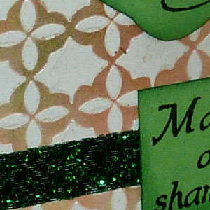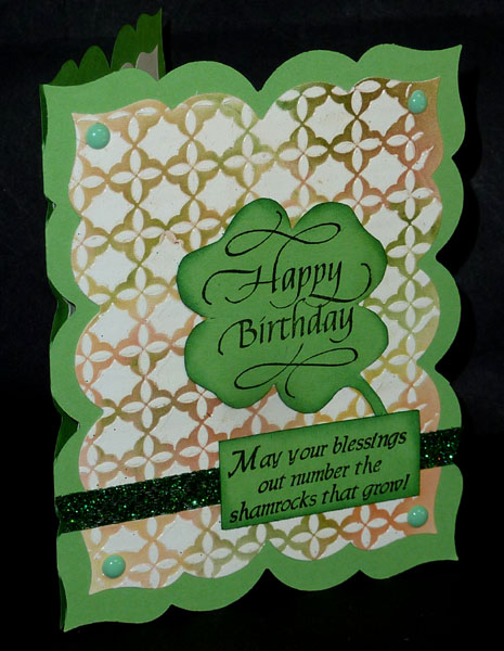 I used the Kasbah 6 x 6" stencil and a palette knife to smear the glossy white paste onto white cardstock. Allowed it to dry naturally, then sponged various Distress colors over it (Peeled Paint, Scattered Straw, Dried Marigold), then wiped of the excess from the glossy areas. Die cut with a Spellbinders Grand "Labels 28". Side folded my green card and die cut with the next size up, staying shy of my folded edge. Adhered my background piece tot he front. Cut a glittery green ribbon and adhered with Sookwang tape. Stamped the sentiment with Versafine Black Onyx on a scrap piece of the green, then cut it out in a shamrock shape. Hit the edges with Distress "Pine Needles". Adhered to card. Stamped the quote with the black, cut in a rectangle shape and adhered to card. As a final touch added the green enamel dots to the four corners. |