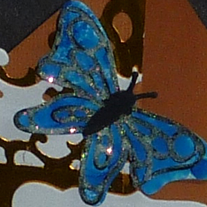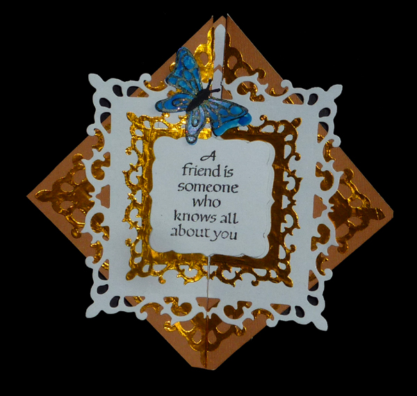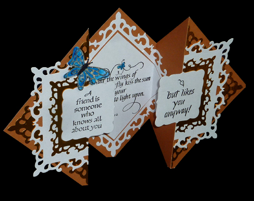 I cut my card base from a carmel colored textured cardstock. It's basically 3 overlapping squares that run along the same horizontal line (point to point), and each of the horizontal points meets the vertical line of the points. I die cut the largest of the Spellbindersd "Fleur de Lis" squares set from a gold origami foil paper, adhered it to the card front and then carefully cut it apart at the center line. With the same die, cut the white layer and did the same. Then cut another gold foil layer using the next sized die. Adhered it and carefully cut the center again. Stamped half the friendship quote on white cardstock using Versafine Black Onyx and clear embossed, then die cut using Spellbinders "Labels 15". Did the same with the bottom half of that quote stamp. Adhered the one on the left first, then with removable tape, tacked it under the left piece and perfectly aligned the two. When happy, closed the card so it would adhere onto the right side. Removed the removable tape. Stamped the "Wings" quote, same as above and trimmed close. Die cut the largest Fleur de Lis from white cardstock and trimmed it close to the edging. Adhered it to the inside, then adhered my quote square leaving a small channel showing through. Added a bit of Glitter Ritz micro fine glitter "Royal Blue" and a quickie glue pen. Die cut the outside butterfly (Memory Box), outline from black cardstock, body from some scrap decorated paper. Applied quickie glue to the outline and sprinkled with Glitter Ritz Warm Highlights. |