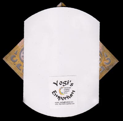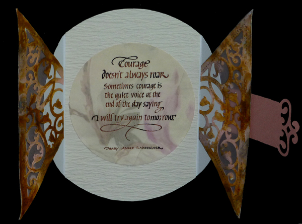 I cut my large 6" circle using an EK Success Circle Scissor from white cardstock. Scored at 1" on either side for my flaps. Die cut my triangles (4 of them) from white cardstock and smooshed them through Distress paints on my craft sheet using Tarnished Brass & Spun Sugar and misting with water. Die cut two pieces of pale pink vellum and adhered to the backs of two of the triangles using Sookwang tape, then adhered it to my card flap. Placed one of the triangles on the back extension and trimmed it down to the card fold, then adhered it to the overhang triangle. Did the same on the opposite side. Used the balance of these triangles on the inside, trimming where necessary. (See back view at right) Trimmed a piece of white Ruche paper to fit my inside panel to the fold lines. Stamped the quote onto a scrap piece of floral paper using Versafine Vintage Sepia and touching with a Black Onyx pad, then clear embossing, die cut with a Spellbinders circle die. (See inside pic below). Stamped the companion sentiment with the same pads, clear embossed on a pink toned Bazzill Monochromatic cardstock, then die cut with Spellbinders "Fancy Tags" die. Adhered to card and I added a couple loops to hold the card closed. (See detail pic at right). Added some white half pearls.