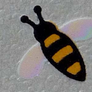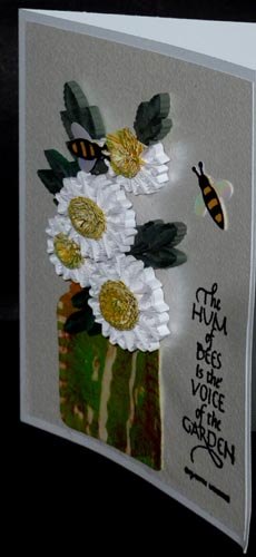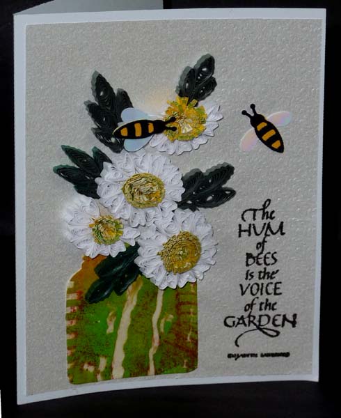 I used a white printed paper for my background (Paper Roots) and adhered to my white card. Die cut the jar (Memory Box) from decorated paper, cut the jar shorter as well. Applied Perfect medium and clear embossed making it have a sheen like porcelain. Adhered to card. adhered my quilled elements. The leaves are crimped strips formed on a quilling comb and then filled in with Marquise. Stamped the quote with Versafine Black Onyx and clear embossed. Die cut the bees (E Craft Designs) from white Shimmer Shhetz for the wings, and black and yellow adhesive back velvet paper for the body. (see image below)