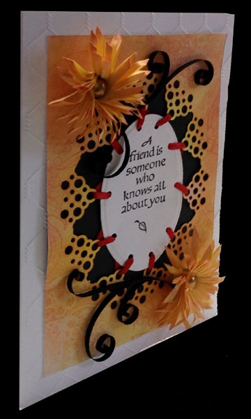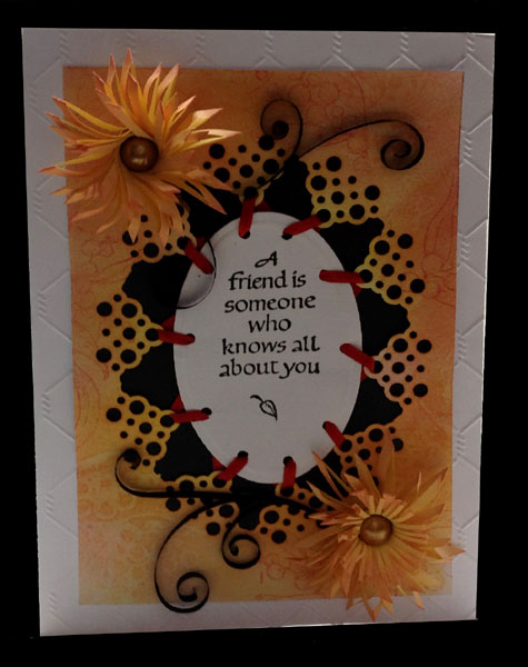 Created: May 27, 2013 They say practice makes perfect... I'm still practicing, but now instead of every 4th or 5th double fringe flower I'm getting it after the 2nd flower. I'll eventually get to the point of every flower working out... BIG GRIN I'm also using one of the Quote Marks Friendship quotes stamp and one of the 10 tiny sentiment stamps on the inside from Quietfire Design, .