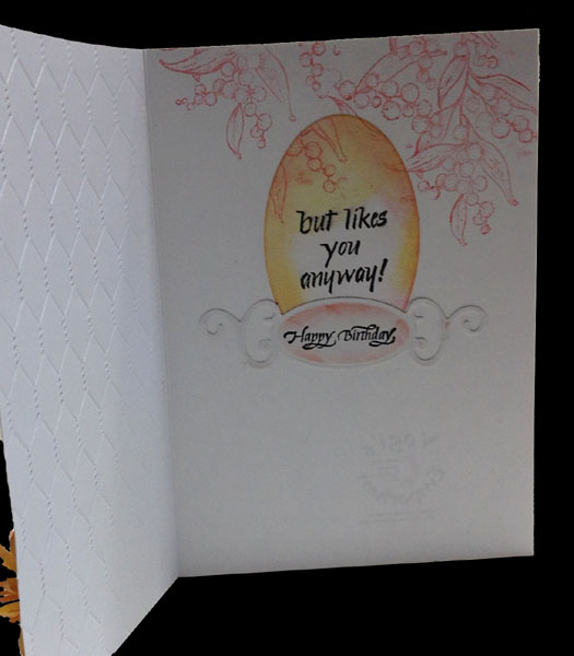 Side folded my white cardstock. Embossed with Cuttlebug "Chicken Wire" embossing folder. I've wanted to do an inside corner punch circle or oval for ages... I finally did the oval and used Martha Stewart's "Bubbles" corner punch. I die cut the oval with Spellbinders "Petite Ovals Large" set from white cardstock, then inserted the punch in the hole and started punching around. I came pretty close to having them evenly spaced... I sponged Distress Mustard Seed & Worn Lipstick all over and trimmed down to fit my card. Stamped the floral sprigs (Flourishes "Blooming Aussie Florals" SS209), some with only water to lift and give a ghost type image, some with the Worn Lipstick. Stamped part of the quote onto one of the drop out ovals I die cut with Versafine Black Onyx. Punched holes to match the punched oval piece, then threaded a red narrow ribbon to hold it in place and as a decorative element. Adhered this layer to black cardstock, then on to my card front. Adhered my double fringed flowers adding a large golden half pearl on top of the tight coil center. The flowers are made from bright yellow copy paper, folded in half and the folded edge sponged with the Worn Lipstick then trimmed down to the width I wanted approx a touch more than a 1/2". The bottom flower I added regular fringing around the tight coil before coiling the double fringe piece. Added the black flourishes rather than leaves. On the inside, stamped the rest of the quote on another oval drop out piece, sponging with the above colors and stamping with the red. Stamped the sentiment on white cardstock and die cut with Spellbinders "Fancy Tags" set sponging with the red. |