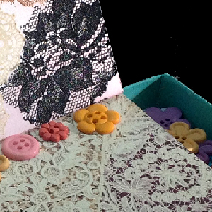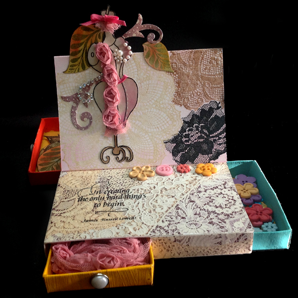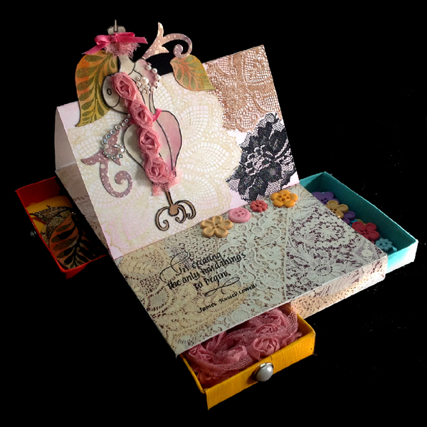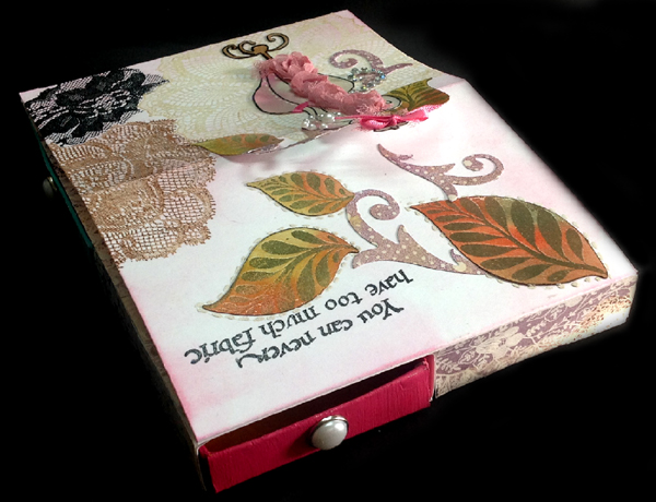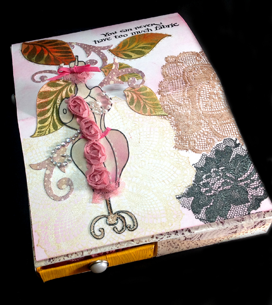 I first constructed my drawers using various cracker packaging and making sure the size when done would create a 5" x 7" card. I gave the drawers a couple coats of gesso and then painted with bright colors using Chroma watercolors. On the insides I used a neutral yellow. I then created the outside covering for each drawer from white bristol board. Then I placed the floor of my easel using 110# Neenah Solar White cardstock and adhering all four drawers. I covered this with lace scrapbook papers. Stamped the quote with Versafine "Black Onyx", clear embossed. Adhered some decorative buttons as my stopper. Electronically cut my mannequin (this is a design I previously used based on a rubber stamp by Loralie Designs). hand drew in my lines with a black Zig Writer. Sponged with Distress "Antique Linen" and a touch of a dirty pink sponge. Adhered the dusty rose Rose ribbon, removing the gauze from either side which I reused on the head sections and the fringe on the bottom. Added a narrow pink ribbon bow, a pearl flourish and faux stitching done with a pointed pen and a mix of my Copic white with Distress Stain brown. The front of the easel was stamped with various lace stamps, first with Stampin Up Hellow Doily" using Distress "Antique Linen" and clear embossing. Using a mask, then stamped the black lace - my newest acquisition (Designs by Ryn "Flowers Lace 2") using "Black Onyx" and clear embossing, then stamped the other lace (Donna Salazar), masking the first two and stamping with Distress "Gathered Twigs" and clear embossing. The leaves are another acquisition from Designs by Ryn "Ornate Leaves". I made silhouette images and electronically cut a bunch. Sponged various colors of Distress in Scattered Straw, Wild Honey & some Forest Moss. Dried, then stamped with Versamark and clear embossed. When cool, sponged heavily with the Moss. |