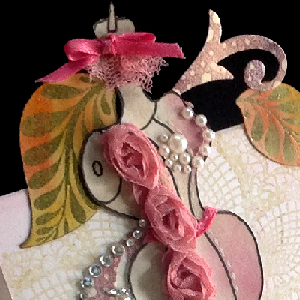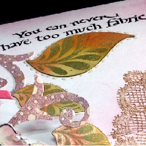 Stamped the sentiment with the black and clear embossed. Adhered my various elements, the leaves, flourishes (Dee's Distinctively "Flourish Set 2") from some previous decorated papers (Xmas Balls Joy), mannequin etc. Added faux stitching with my Copic mix and pointed pen. as a final touch added some lace paper to the drawer edges that were only showing white faces.