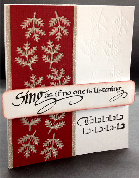 On this first card I side folded the card to 4.25"w x 5.5"h, then lay down a piece of Sookwang tape and just placed the waste on top of it. Sprinkled with Glitter Ritz micro fine glitter in "Star Dust" and burnished. There is a join line under the horizontal quote piece... I dry embossed the pine branch detail on the right side using the waste and a tan rubber mat through my machine. Stamped the "Sing as if..." quote (Woods would be very silent... set) on white cardstock using Versafine Black Onyx and clear embossed. Cut out and rounded the corners and sponged using a dirty Distress red sponge. Stamped part of an Xmas stamp (Deck the Halls... set) with the black. |