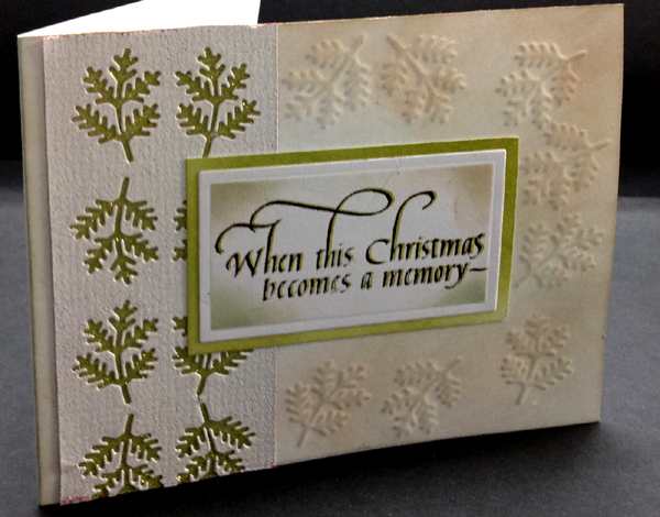 On this 4th card I side folded the card to 5.5"w x 4.25"h. Applied Versamark directly on to the red cardstock and embossed with white embossing powder. Die cut a bunch of the pine sprigs and adhered them to a scrap piece of cardstock (double layered the sprigs) and used it to emboss the texture on the right side. Sponged with the dirty green and brown sponges. Lay Sookwang on the underside of the white embossed piece and adhered to card front. Sprinkled with Glitter Ritz micro fine glitter "Chartreuse". Burnished. Double stamped part of the quote for the front, with the black and clear embossing, then shadow stamping it with Distress "Crushed Olive". Die cut with Spellbinders A2 card die set, sponging with the green and brown around the edges. Used the same die to cut out the under layer, sponging it with the Olive. Used the same double stamping technique for the rest of the quote on the inside.