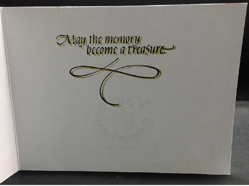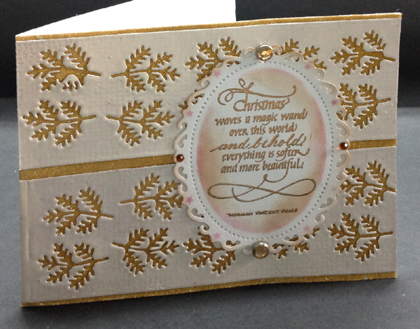 On this 3rd card I side folded the card to 5.5"w x 4.25"h. Colored the waste using a brayer and Acrylic Titanium White paint. Dried, then applied Versamark and embossed with Pearlescent embossing powder. Lay Sookwang over the whole front and adhered the waste strips, sprinkled Glitter Ritz micro fine glitter "Dark Gold". Burnished. Stamped the quote with the black and embossed with Queen's Gold embossing powder. Die cut with Spellbinders "Floral Ovals", sponged the edges with a dirty pink sponge and then a dirty brown sponge. Attached the oval using rhinestone amber brads at the top and bottom and adding small rhinestones on either side. |