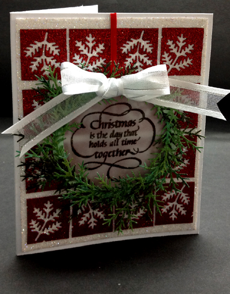 On this 2nd card I side folded the card to 4.25"w x 5.5"h. Made a template to cut between all the die cuts, inked them up with a Versamark pad and embossed with Old Island Red Tinsel embossing powder (my newest acquisition). Cut a piece of white cardstock to leave an 1/8" border all around, applied Sookwant and adhered the embossed die cuts, then sprinkled with Distress "Star Dust glitter. adhered this to the card front. Punched out a punch of pine branches using a McGill punch, colored them with Distress greens and embossed with 3 embossing powders (Distress "Walnut Stain" & "Shabby Shutters", Xing "Metallic Green"). Stamped the quote on a piece of pink toned vellum with the black, clear embossed and die cut with Spellbinders Circle die set. Used the same set to cut a ring from cardstock. Adhered the vellum piece to the ring with Glossy Accents, then started adhering the pine sprigs to the ring. Adhered the ring to the card with 3D tape. Tied the peg bow and attached to ring with Tim's tiny attacher. Added the narrow red ribbon hanger. |