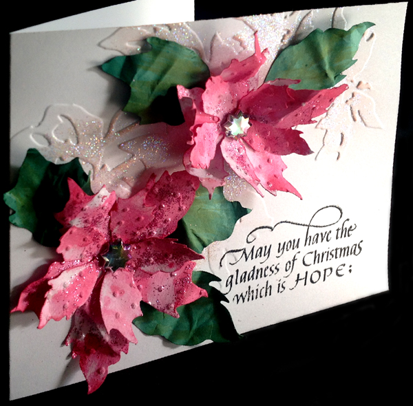 Side folded my white card. Used Tim's poinsettia embossing folder. Hit the high points with a dirty red sponge then a Versamark pad and embossed with Stamp n Bond, heat activated and sprinkled with Distress Star Dust glitter, then reactivated. Used the 2 smaller sized florets for this card. Sprayed the florets with water and only partially put them in the previous pinky inks, giving it a more marble look. Ran thru my machine with Cuttlebug "Swiss Dots" folder, hit the high points with a Versamark pad and embossed with Stamp n Bond, heat activated and sprinkled with Distress Thistle glitter, then reactivated. Adhered the florets, added a multi pointed rhinestone center. Created leaves with the largest floret die, staining with Distress greens. drying and adhered the petals separately. Stamped the first part of the quote on the outside with the black and the rest of the quote on the inside. |