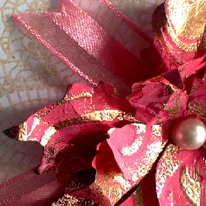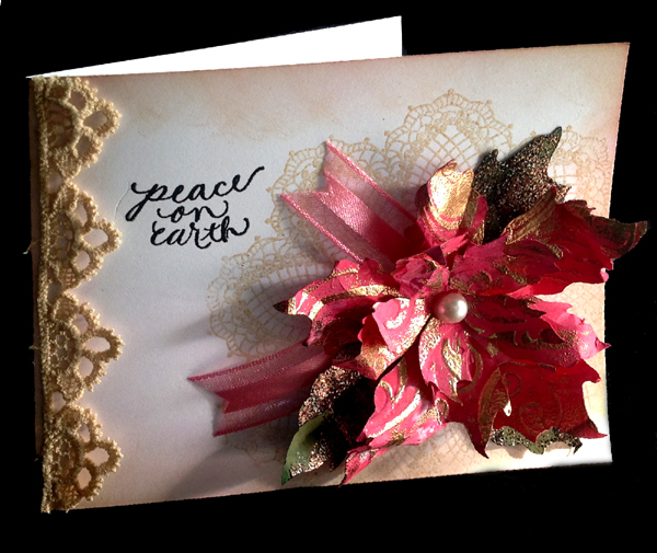 I side folded my white card. The Poinsettia was die cut from white cardstock using Tim's "Tattered Poinsettia" die. I used the dirty craft sheet from the previous card and sprayed Dylusions "White Linen" which gave me a nice pink. Misted my florets with water and smooshed them through the inks. Dried them. Placed them in the "Musical Flourishes" embossing folder, hit the high points with a Versamark pad and embossed with Queen's Gold, then scrunched the petals and assembled them. Stamped the doily (Stampin Up "Hello Doily") with Distress Antique Linen and clear embossed. Sponged a dirty brown sponge around the edges and then one with pinks. Adhered my flower. I then decided I wanted more, so die cut another of the largest florets, used Distress Stains in various greens dried and then covered them up with Gattered Twigs. Swiped a Versamark pad over them and embossed with Rustique Tin Can. Tore off the individual petals and adhered them separately. Added the two pink gauze ribbon ends and the large white half pearl. |