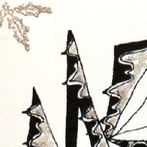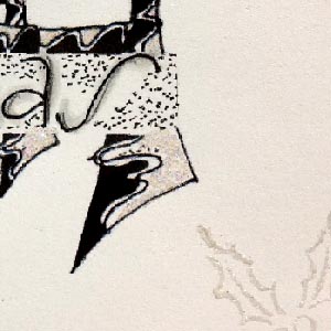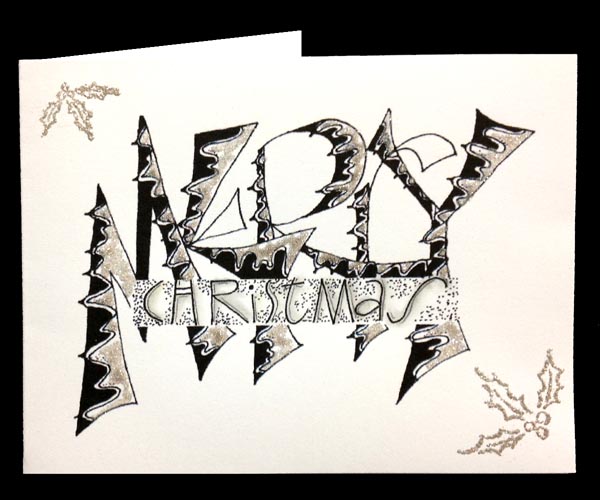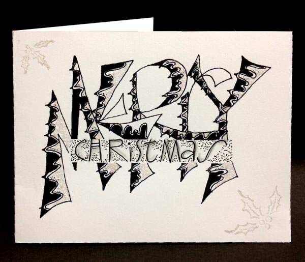 I drew my letters and colored the black sections with a micron pen. Wrote the word "Christmas" with the micron and added pointillism for some shading. Scanned the image and printed out on 110# white cardstock. Then added the pencil shading on the Christmas word and the glitter detail on the Merry word. For the card above I used Stickles Fine Glitter "Star Dust". For the card below I used Glitter Ritz micro fine glitter "Cool Highlights" and Glitter Ritz "Star Dust" sprinkled randomly. Stamped the holly leaves - the smaller one in the upper left corner and the large design in the lower right corner using Versamark and embossing with Stampendous "Stamp n Bond", heat setting and then sprinkled the same glitter as the word. Heat set again. I ran off a bunch of these and can print more if needed. They're quick and easy and I think effective. BIG GRIN
