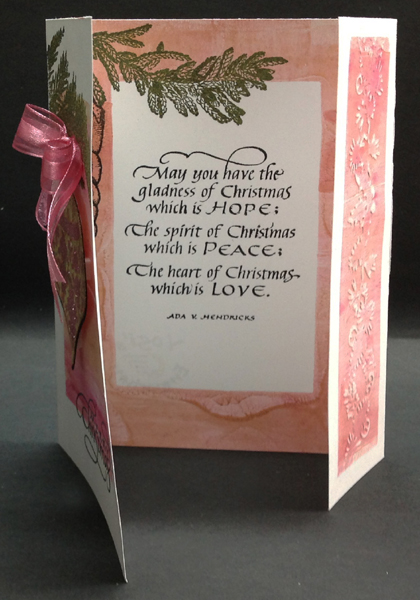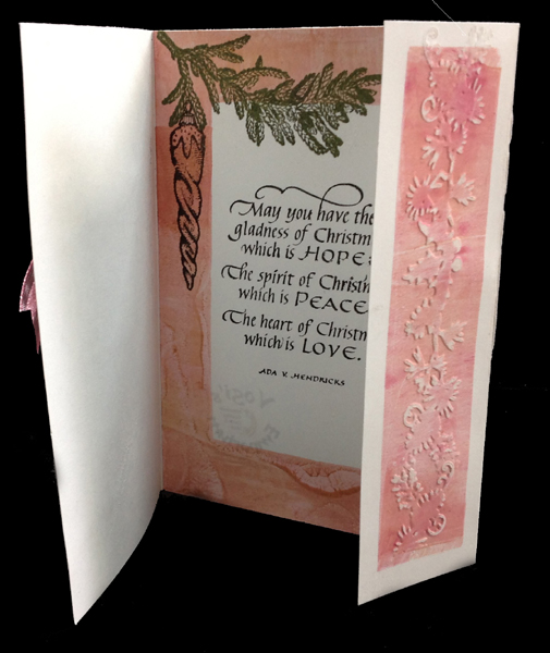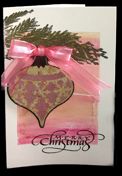 Scored my card at the 4" mark, then at the 9" mark leaving the last flap at 2" using Neenah Solar white 80# cardstock. I created masks/stencils and temporarily adhered them to my card front, flap and inside. Brayered my Gelli plate with Americana "Royal Fuchsia", Folk Art "Rose Blush" & Decoa Art "Emperor's Gold". I wasn't concerned about blending the colors because I wanted an interesting color mix without a lot of fiddling... Pressed down my card sections, re-brayering as needed. Stamped the pine branch (Old Island) with Versafine Black Onyx and embossed with Distress "Shabby Shutters". Stamped the sentiment with the black and clear embossed. Adhered the ornament with 3D foam tape after the card was completed and then adhered a pink gauze peg bow. The ornament was created on my electronic cutter, using one blade depth for the detail work and then another blade depth for the outline cut. Some of the release papers removed and gold leaf applied, burnishing well, then more release paper removed and using Glitter Ritz micro fine glitter in either pink or java. The flap I ran through my embossing machine using Sizzix "Holiday Garland" border, then distressing the high points with a sanding block. On the inside I stamped the quote with the black. Stamped the pine branch (Impression Obsession) with the black and embossed with the Shabby Shutters. Stamped the icicle ornament (Flourishes "Holiday Sparkle") |