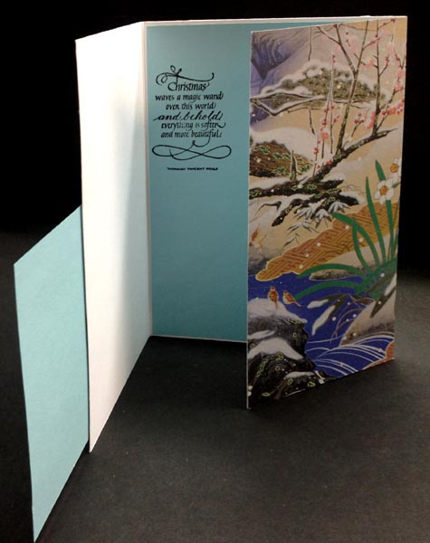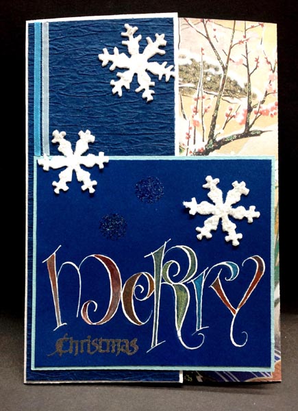 I drew my word "Merry" on some calligraphy paper and then transferred it onto the dark blue cardstock. Outlined with Copic Opaque White ink mixed with water (50/50) and used a Nikko G pointed pen nib. When dry, used both Finetec watercolors and Yasutomo watercolor palette and my water brush. Stamped the "Christmas" word with Versafine "Toffee" and embossed with "Silver Detail". Trimmed the piece down and layered on to a light blue cardstock. Scored and folded my white cardstock into a gate fold style. PS mine overlaps rather than meets in the center. Layered a piece of dark blue Ruche decorative paper to the front panel, then my calligraphy panel. On the inside panel I layered a piece of gorgeous Oriental scrapbook paper (Kodom Inc "Winter Garden"). Die cut a bunch of snowflakes (Sizzix Tim's movers & shapers "Snowflakes") from white cardstock, put a layer of white glue and sprinkled with Crystal Snow glitter. set aside to dry and then adhered to card. Stamped the little snowflakes with Perfect Medium and embossed with Kaleidescope embossing powder. Added to blue pieces of narrow ribbon as a border on the left side.On the inside I layered a piece of the blue cardstock and stamped the quote with Versafine Black Onyx.
