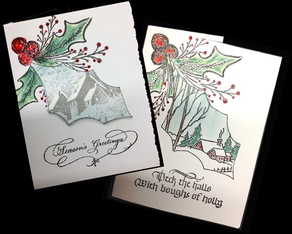 both cards start off the same, side folded white cardstock. Hand cut a large holly leaf and use both the negative and the positive of it. I place my stencil part in the position I want and then stamp the scene. I then place the mask over the scene and stamp the holly branch/berry image. Both cards have the holly leaf outlined with a black Micron pen. The scene (Stampendous "Snowy Postcard") was stamped with Versafine "Smoky Grey", sponged with some Distress Broken China and colored with colored pencils adding white Copic ink to the roofs. Holly berry (The Artful Stamper "Large Holly") stamped with Versafine Black Onyx, colored with colored pencils and Viva red Pearl Pen added to the large berries, and red Stickles to the little berries. Stamped the sentiment with the black. |