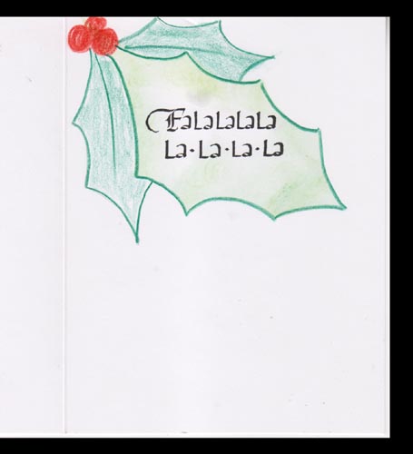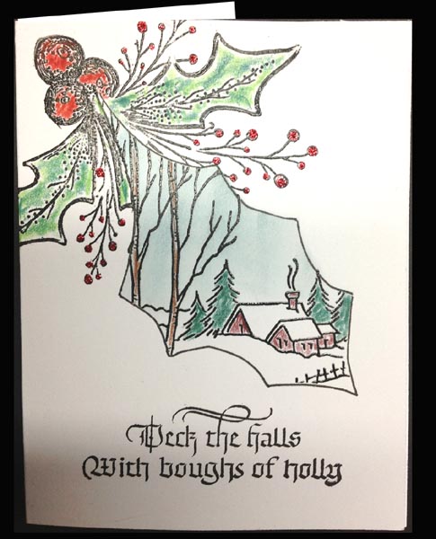 The scene (Stampendous "Forest Cottage Scene") was stamped with Versafine "Black Onyx" and clear embossed, sponged with some Distress Broken China and colored with colored pencils. Holly berry (The Artful Stamper "Large Holly") stamped with Versafine Black Onyx and clear embossed, colored with colored pencils and added red Stickles to the little berries. Stamped the sentiment with the black clear embossed. Inside of card stamped the rest of the quote stamp. Used the stencil to create one of the holly leaves around the stamping, then added a couple more. Colored them in.