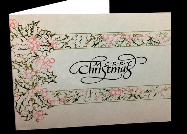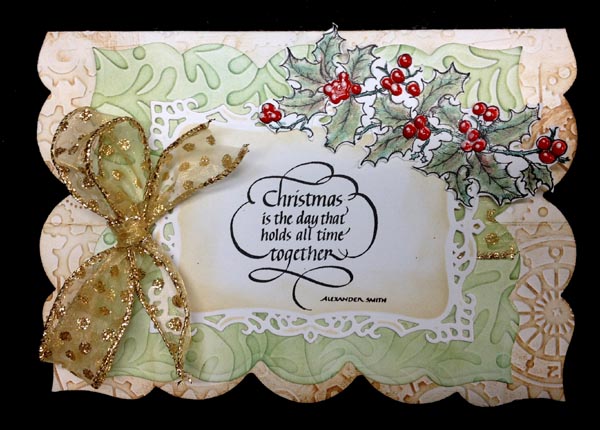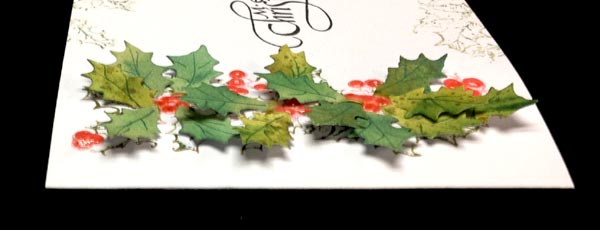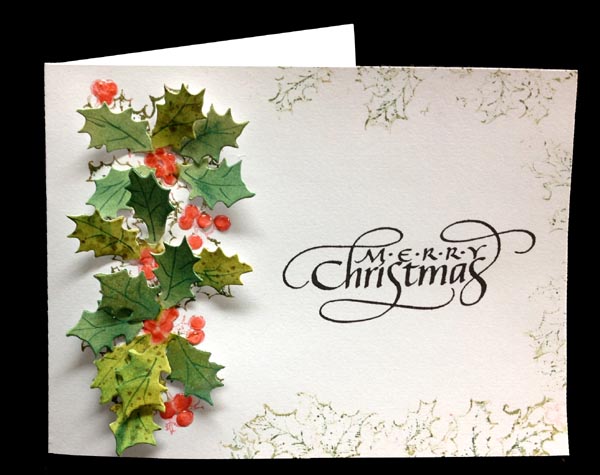 I side folded my white card. Using the same watercolor technique as above, stamped the image on the left side of card front, and without re-inking the stamp, just misting with water, stamped a 2nd generation border, turning the stamp to an unused portion to continue stamping around the edges. Colored the berries with a red Distress marker, when dry, added Glossy Accents to each berry. Set aside to dry while doing the next step. Die cut a bunch of holly leaves (Sizzix Tim's "Lampost" die set) from some greenish decorated cardstock. Cut the leaves apart and sponged a bit more of the greens over each leaf, then used the green marker "Pine Needles" to add veins. Applied a globs of white glue (Aleene's Tacky glue) and stuck leaves in the glue globs so they stood up at an angle. Allowed that to dry thoroughly. Stamped the sentiment with Versafine Black Onyx. |
