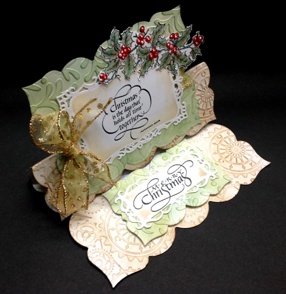 I created the easel by cutting white cardstock to 7"w x 10"h, folding it in half and then folding one of halves in half again. So scored on 2.5" and 5". Embossed the front easel section using Sixxix "Steampunk" folder, then repeated for the floor of the easel. Sponged with Distress "Old Paper" and touched here and there with "Vintage Photo". Die cut the green layer with Spellbinders Grand Labels #28, ran through with Sizzix "Holly Leaves" folder, sponged with Distress "Shabby Shutters" and a touch of the "Old Paper". adhered a small piece of gold glittered ribbon to the right side in the center. Stamped the quote with Versafine Black Onyx on white cardstock, die cut with Spellbinders "Decorative Labels #8", sponged some of the paper around the edges. Adhered to green layer. Created a bow from the glittered ribbon for the left side, attaching it with Tim's stapler "tiny attacher". Adhered these layers to the easel front piece (lower half only)