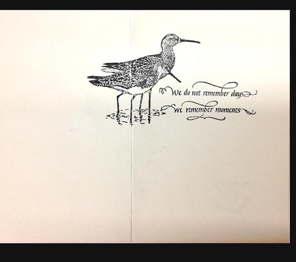 For the background: on a regular piece of white cardstock, applied "Scattered Straw" direct to paper. The sponged "Wild Honey", "Spiced Marmalade". With my finger I smeared some glue here and there and set aside to dry. (all the yellowy splotches are where the glue was applied). After the glue dried, I sponged "Salty Ocean" all over. Trimmed it down to fit card front leaving a scan 1/16" border all around. Side folded my cream toned card. Adhered my background. Stamped my bird (Old Island) and the Water Lily border (Beeswax) using Versafine Black Onyx. Stamped both these images on some scrap white cardstock. The flower border with the black, the bird - coloring the stamp with Distress markers, misting with water and then stamping. cut both out around the solid portion of the images. On the bird I also added some flicks of Wink of Stella brush to add some glitter. Adhered the bird to the card on top of the stamped image. Adhered the flower border using 3D foam tape, also on top of the stamped image. Stamped the sentiment with the black and clear embossed. Die cut some foliage (Memory Box "Leafy Branch" & Marianne Design) from decorated cardstock. On the inside stamped the quote with the black. Used some post it note as a mask and stamped the birds (Old Island) with the black. |