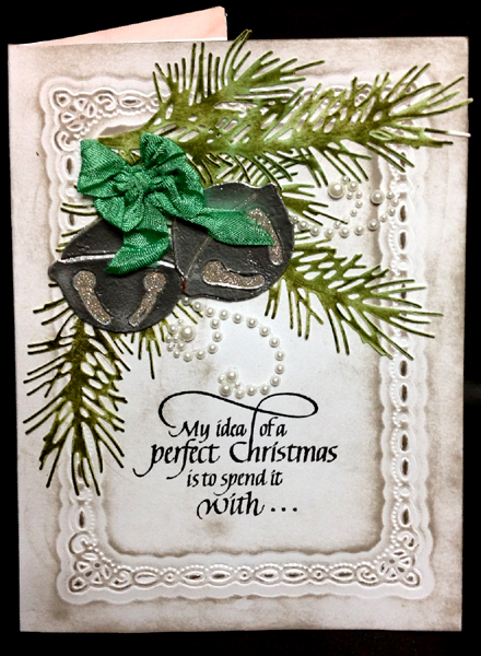 I scored and folded my white card. Embossed the frame design using Spellbinder's "Decorative Labels Eight" largest die and my tan mat. Ran through my machine, then hit the high points with Distress "Pumice Stone". Dried. Stamped the quote (minus the word "you") using Versafine Black Onyx and clear embossed. Added the three black dots with a micron pen. Die cut the jingle bells (Sizzix Tim's Movers & Shapers) from white cardstock, then hand cut a solid under layer. Adhered the two toegether, inked it with Versamark and embossed with silver embossing powder, twice. Applied Quickie glue to the two little curved areas and sprinkled with Ritz micro fine glitter "Stardust". Die cut the pine branches (Impression Obsession "Fall Branch") from white cardstock. Left it clinging to my large piece of cardstock and inked it with Distress "Forest Moss" and sponged "Evergreen Bough", then removed it from the larger cardstock. Adhered the branches to the front of the card. Then adhered the bells. I won a bunch of ribbon from "Little Scrap Pieces" and the green one was perfect for this card. I tied it in a double loop bow using my quilling comb like a fork... going over every second prong. This little bow style was taught at our last quilling session and definitely comes in handy... As a final touch on the front, added some white pearl flourishes. |