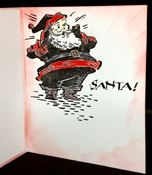 ![]() inside On the inside, stamped the Santa (Stampers Anonymous "Christmas Memories") using the black, clear embossing and coloring with Prisma colored pencils. Stamped part of the other quote, using only the word "Santa", stamping with the black and clear embossing. Sponged the edges with Distress "Worn Lipstick". |