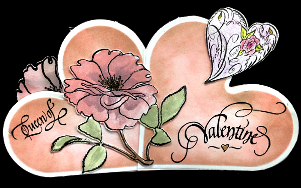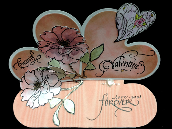 I die cut two of the largest hearts (Spellbinders "Classic Hearts"), embossed them and sponged with color (Distress "Picked Raspberry" & some "Walnut Stain"). Adhered them together, then used them to cut my easel card base. Covered the back and the floor with a pink toned moiré scrapbook paper. Created a stamp silhouette image (HOTP "Fresh Cuts" set) and cut with my electronic cutter, then stamped with Versafine Black Onyx, painted with US ArtQuest Pastelle Mica Color palette. adhered one to the front and one to the floor to act as my stopper. I had the extra stamped heart (Quietfire Design) from a previous project. eCut with my electronic cutter, stamped with the black and colored with Prisma colored pencils. Stamped the sentiments with the black. Added some Wink of Stella gold in the small heart. As a final touch added the heart & mini pearl stickers. |