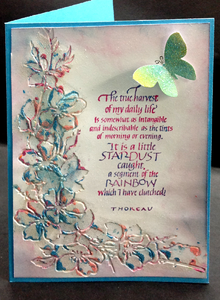 The embossing folder is from Ecstasy Crafts "Garden Spray". I used the Gelatos on the raised portions of the folder, misted with water, placed my 110# white cardstock onto the unpainted side, then closed the folder and ran through my machine. Misted the folder again and ran a 2nd piece of cardstock through, that's what I used for this card. Trimmed it down, sponged a bit of a dirty blue around the edges and then a touch of dirty pink, then adhered it to an aqua toned side folded card leaving a 1/8" border all around. Stamped the quote using juicy Distress mini pads in "Picked Raspberry" all over and hitting here and there with "Salty Ocean". Final touch added the glittered butterfly from a previous eCut project of a butterfly circle by Suzanne which can be found on the Silhouette on line store. |
