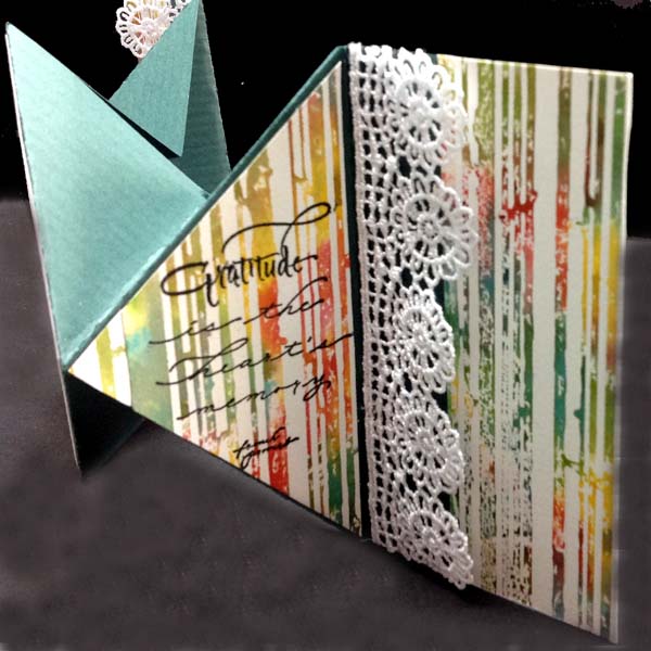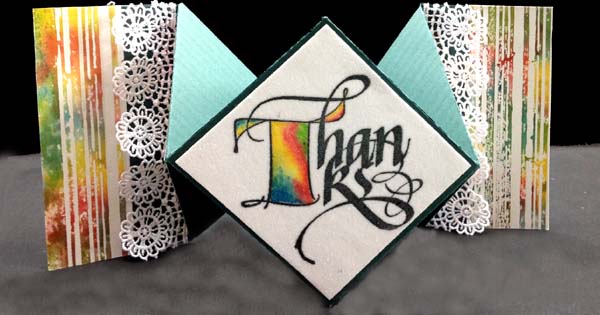 I scored and folded my green card (See diagram below). Cut 2 more pieces from the same green cardstock (2.5" x 5" ea) and adhered them to the backs of the flaps. Painted a stencil (Tim's "Stripes") using Distress Mini pads ("Mustard Seed", "Spiced Marmalade", "Salty Ocean", Mowed Lawn"), misted the stencil heavily and then stamped onto watercolor paper (any will do, but I used Arches 90# HP). Leave the stencil on the paper for a minute, pressing down with a paper towel to absorb the excess that oozes out of the open areas. Carefully lift stencil and dry the paper. Trim to fit in the selected areas. Stamp the quote with Versafine Black Onyx and clear emboss. Adhere some lace trim using a glue gun. Apply 5" w Sookwang tape to a piece of white cardstock. Remove the release paper and cover with Ritz Glitter micro fine "Cool Highlights". Burnish well. Stamp the "Thanks with the black and clear emboss. Careful Sookwang is not heat stable, so keep moving your heat gun to avoid hot spots. I used Derwent Inktense Watercolor Pencils and moved the color around with a wet paintbrush, wiping the brush on a clean paper towel to avoid muddying the colors. Allowed it to dry. Trimmed it down and adhered to square area of the front of my card. |