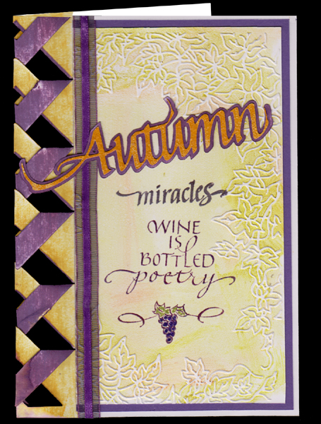 I ecut, masked with post it notes, colored with Distress (Seedless Preserves & Dusty Concord) direct to paper, removed masks and placed them on the other side coloring with (Scattered Straw & Wild Honey), scored and folded. Cut a separate piece of white cardstock and embossed with Sheena Douglas "Ivy Frame" inking the negative side of the folder with the Straw and hitting here and there with the Honey, misting with water then embossing. Trimmed and adhered to purple cardstock then on to my card front. Adhered two piece of narrow purple ribbon (one gauze and a silk narrow ribbon). Stamped the word "miracles" cut from the "If You Don't Believe" stamp (or you could mask off the unwanted areas) using Versafine Black Onyx, clear embossed. Stamped the Wine quote with Distress "Dusty Concord and clear embossed. Stamped the grape flourish with the purple, clear embossed, touched with a Quickie glue pen and sprinkled with Glitter Ritz micro fine glitter "Purple" & "Chartreuse" eCut the word "Autumn" from white cardstock and while on the mat inked with Versafine "Toffee, removed from mat and embossed with Stampendous opaque "Honey" embossing powder. eCut a shadow layer and colored with the purples, then adhered the yellow layer, then on to the card. |