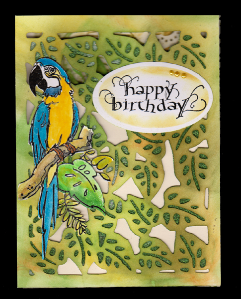 I eCut the background from white cardstock and sponged Distress ("Mustard Seed", "Wild Honey", "Shabby Shutters", "Forest Moss", & "Mowed Lawn") all over. Then I eCut another background piece but this time cutting solid leaves. Applied Versamark all over and embossed with sticky embossing powder, adhered the two background pieces together, then added Glitter Ritz micro fine glitter "Sweet Basil", then adhered the completed background to the easel card front. I eCut a silhouette image I created of the macaw stamp, then stamped the image with Versafine Black Onyx and clear embossed. Colored with watercolors. Stamp0ed the sentiment with the black, clear embossed and die cut with Spellbinders oval die set. Sponged some wild honey around the edges and adhered to card front adding three mini yellow half pearls. Embossed the floor using Couture Creations "Ambrosia" embossing folder, hit the high points with the Distress pads from above. Colored some cardstock with the above colors from the background and die cut the tropical leaves (Dee's Distinctively "Philodendron"). Adhered the bottom part of each leaf to the floor creating my stopper.