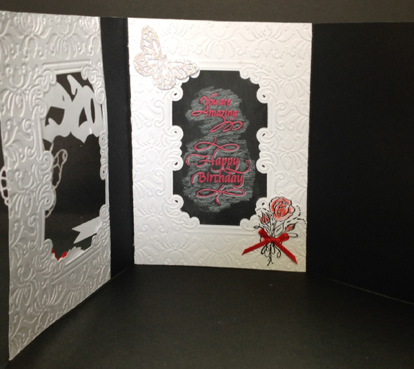 I cut 3 of the Cuttlebug Emboss Plus "Brocade Window" pieces from white cardstock. Adhered one to the edge of my base card for the front. Adhered the 2nd one to the inside flap matching the position to the front flap one, and the 3rd to the inside. The base card is black. Colored some watercolor paper with Dylusions sprays on both sides, dried, then die cut with Marianne Designs "0162" set for the main flower and the base of the flower from "L031" set. Used a large balled stylus to massage the paper prior rolling in to shape. Adhered to inside of card. Die cut the leaves (Cheery Lynn "Rose Leaf Strip") from white cardstock and shaped them before adhering both to the roses and to the front of the card. added a narrow red ribbon bow to the front group of leaves. Stamped the sentiment with Versafine Black Onyx and clear embossed, then cut close to the stamping adding the notched edge on one side. adhered to card front and added the large pearl. |