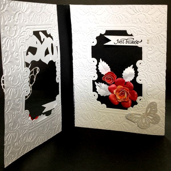 adhered to cardstock. Wrote the word "roses" with a 6mm parallel pen, then scanned it and eCut as well as a eCut shadow layer. Top layer was colored with a red Distress marker, Versamark applied and clear embossed then adhered to the shadow layer of white cardstock then on to the card. I stamped the word "Just Because" with the black, clear embossed and cut close to stamping adding the picot edge then on to inside page of card adding two small white pearls. On the inside I stamped the sentiments with Versafine "Habanera" and embossed with red embossing powder. added soem shading and highlights with a white Prisma colored pencil. Stamped the rose bouquet with the black, clear embossed and colred with a red prisma colored pencil, then fussy cut around the image and adhered to card adding the narrow red ribbon bow. Punced a couple butterflies (Martha Stewart "Large Monarch") from white cardstock, applied Versamark and embossed with Sticky embossing powder, then sprinkled with Distress Glitter "Star Dust" |