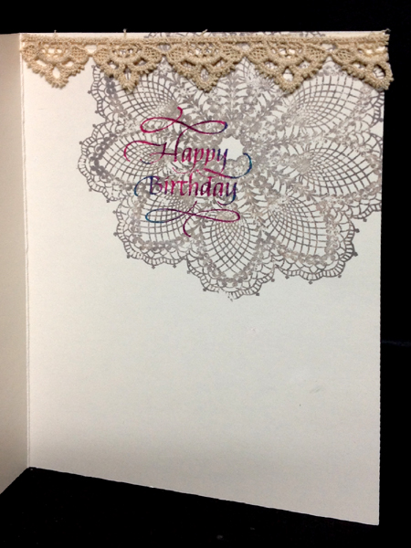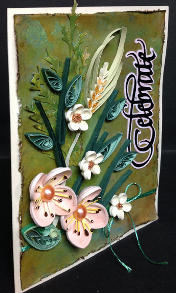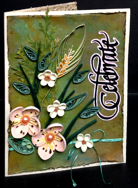 The background: craft sheet with blobs of Distress Acrylic daubers (Weathered Wood, Broken China, Salty Ocean, Peeled Paint, Forest Moss, Antique Bronze, & Tarnished Copper) misted with water and white cardstock smushed through the colors. Cardstock misted, let the colors run a bit and then dry. Sponge Distress pads in similar colors all over, sprinkle with water, let activate and then dry. Trimmed down to fit card and used Tim's edge distresser to rough the edges. Wrapped some green metallic thick thread around a couple times and tied a bow, then adhered it to my side folded cream toned card. eCut the word Celebrate from white cardstock, colored with a black marker then embossed with black embossing powder. eCut a shadow layer and colored with Distress Spun Sugar. Adhered the two elements together, then on to the card front. Adhered a die cut ferny leaf from my stash and my quilled elements adding some made in a previous session (the double layered quill paper leaves in two shades of green, the long grasses made using a quilling comb, wheat sprig using my combing gadget. On the inside stamped the lace doily (Stampin Up "Hello Doily") using Distress Pumice Stone. Dried it then stamped the sentiment using Distress mini pads (Picked Raspberry, Seedless Preserves & Peacock Feathers), clear embossed. A final touch added a piece of beige lace. |