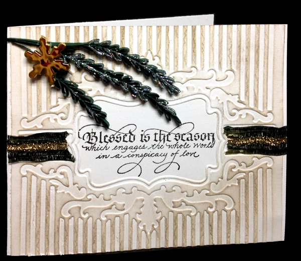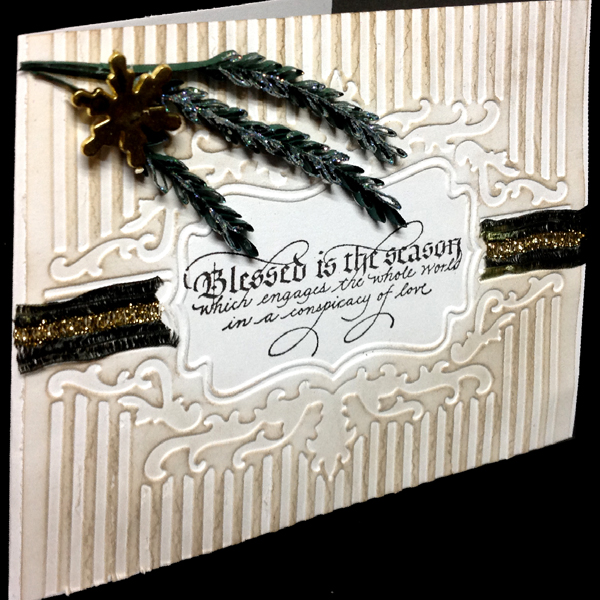 Side folded my white card. Embossed a separate piece of white cardstock with Spellbinders mBossibilities "Framed Petite Labels" embossing folder. Hit high points with Distress "Pumice Stone". Adhered to front of card. Stamped the quote with Versafine Black Onyx. Adhered the pine branches which I added Stickles dry fine Glitter "Star Dust". Adhered the gold snowflake using Golden's Heavy Gel medium. Added some Sari ribbon "Holly" to either side of the embossed label.