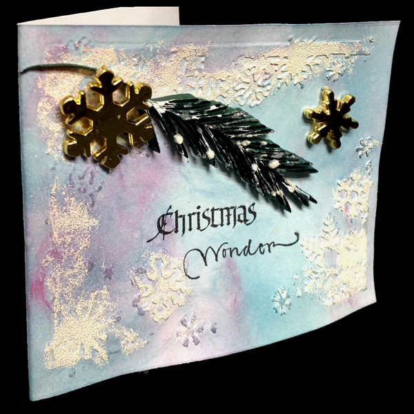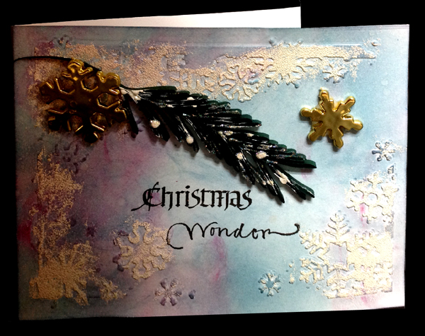 Side folded my white card. Embossed with Cuttlebug "Distressed Snow" embossing folder. Hit high points with Versamark pad and embossed with white embossing powder. Sponged Distress "Tumbled Glass" all over, then some "Broken China" and then some "Picked Raspberry". Misted and sprinkled with water. Dried. Stamped the sentiments with Versafine Black Onyx. Adhered the pine branches which had "Snow Writer" heat activated and then some Glitter added. Adhered the gold snowflakes using Golden's Heavy Gel medium. |