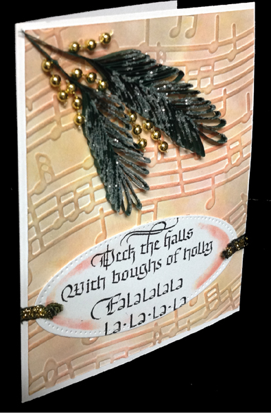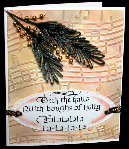 Side folded my white card. Embossed a separate piece of white cardstock with Spellbinders mBossibilities "Music" embossing folder. Sponged with Distress "Scattered Straw" all over then some "Worn Lipstick". Sponged edges with Pumice Stone. Stamped the quote with Versafine Black Onyx. Die cut with Spellbinders "Majestic Elements" set. Sponged edges with the red sponge. Adhered to card front. Added some Sari ribbon "Holly" tied in knots at one end. Adhered the pine branches which I added Stampendous "Crystal Snow" glitter. Adhered the gold beads using Golden's Soft Gel medium.