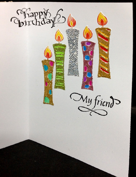 I side folded my white card. Die cut the border (Spellbinders "Antique Frame & Accents") from white cardstock, applied Versamark and embossed with Pearlescent embossing powder. Adhered to right edge. Cut a piece of natural colored cork (DCWV "Cork Solid" 12 x 12 Stack) and adhered to card front. Stamped the quote using Versafine Black Onyx and clear embossed. Adhered a piece of beige real lace, a piece of salmon dyed ribbon (won from Little Scrap Pieces"), and a piece of corrugated yellow cardstock. eCut the lantern from gold colored thin metal sheet, ran through my embossing machine with Cuttlebug "Swiss Dots", applied Distress Black Soot Dauber all over, allowed to partially dry, then wiped off the excess. Die cut the candle (eCraft Designs), colored with Prisma colored pencils and the added glitter (Stickles dry glitter "Diamond") to the candle. Designed some oval loops, eCut, painted with the black dauber and adhered them together to create my chain. As a final touch added the rhinestone squares in the corner. On the inside die cut more candles, colored or did some doodling, applied Quickie Glue and various colors of Glitter Ritz micro fine glitter and adhered to inside of card. Stamped the sentiments with the black and clear embossed. |
