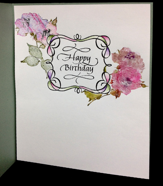 On the inside, stamped the flourish frame and the sentiments (both Quietfire Design) using the black and clear embossing on a white cotton paper. Colored some of the flourish openings with Prisma colored pencils and then a white pencil to blend. Stamped the flowers (Rubber Necker "Dual Rose") - the upper ones using Distress Mini pads and misting with water, the lower ones using Distress Markers and misting with water. (like the lower ones better...). Then adhered the paper insert into the card. |