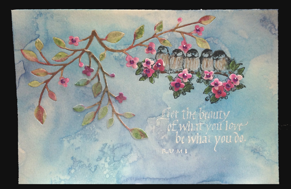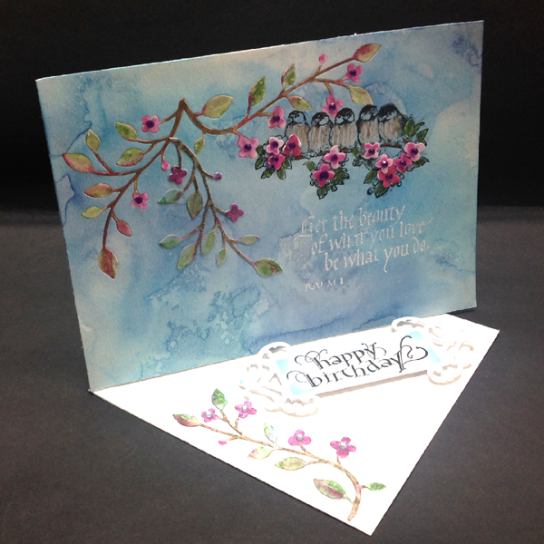 I used 90# Arches hot press watercolor paper. Sponged Distress blues (Salty Ocean, Chipped Sapphire & Broken China) all over then misted heavily with water to get the colors moving, mushed it around a bit with my finger, dried with a heat gun. Die cut the flower branch (Memory Box "Lavish Branch") and colored with Distress markers, misting with water and drying. I set this branch aside. Die cut another branch from an unpainted piece of the watercolor paper and colored it the same way. It gave it a softer look. The next thing Jennifer did was put a bunch of tape (I used my ATG tape) on a piece of cardstock, pressed down the blue painted piece and then inserted the die cut piece like a puzzle. No raised edges this way. I cut the first branch piece at the join and used half on the front and a piece on the floor. Stamped the birds (Penny Black "Enjoy Life" set) with Versafine Black Onyx and colored with Prisma colored pencils. Cut two more branches colored with the markers and cut the flowers off to glue on to my stamped image. |