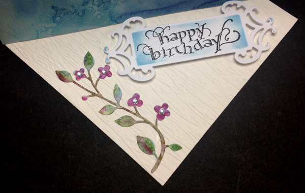 Stamped the quote with Versamark and embossed with white embossing powder. adhered a piece of white Ruche cardstock to the floor, adhered that piece of branch. Stamped the sentiment on a piece of white cardstock and die cut with Spellbinders "Fancy Tags Two" and sponged some blue around the edges. Adhered to floor with 3D tape. As a final touch added purple or clear rhinestones to the flower centers. |