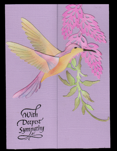 I scored my white card... and since I scored in the wrong place, had to cut off the covers and replace them with my lavender Bazzill Monochromatic cardstock, scored in the right place... I die cut the bird (Dee's Distinctively) and sponged with various Distress colors ("Mustard Seed", "Picked Raspberry" & "Salty Ocean") then assembled and adhered the pieces and on to the card. I die cut the floral elements (Dee's Distinctively), sponged heavily with the Raspberry and embossed with Inkadinkado Hot Pink" embossing powder. The flourish is from my stash (Marianne Designs) and just sponged with a dirty green sponge and hit with some brown. |