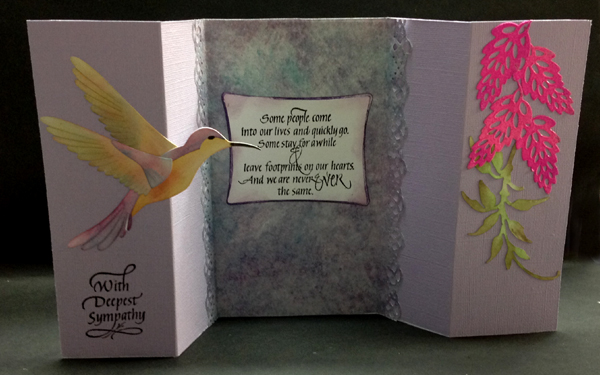 Stamped the sentiment with Versafine Black Onyx & clear embossed pen. Cut a piece of lavender marbled scrapbook paper, and punched (Martha Stewart "Swirling Lace") a decorative edge on both sides, then adhered to inside of card. I had some drop out pieces from my previous card on my desk, so used those to stamp the quote on the smaller one using the black and clear embossing, sponged a bit of "Dusty Concord" around the edges. Used the Concord all over on the larger layer.