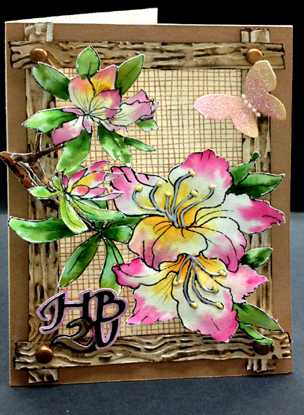 I started by applying Gelatos to the embossing folder (Spellbinders Bark/Bricks) misting with water, then placing my 110# cardstock in the folder and running through my machine. Dried. Then sponged and direct to paper using Distress browns. Trimmed them down and edged the raw edges with Walnut Stain, then glued them to create the frame, adding the large copper brads. Side folded my cream toned cardstock. Cut a piece of tan cardstock to fit the wood frame piece and adhered to card front. Stamped the net background stamp (Penny Black "Warm Wishes set) using Versafine "Vintage Sepia" and clear embossing. Trimmed down and adhered to back of wood frame and then to card front. Painted the flowers using the Peerless watercolors. Added some Pearl Pen details for the stamen, then fussy cut around the flowers and adhered to card with 3D foam tape. eCut the HB2C from white cardstock, colored with a black pen and embossed the "2" with Queen's Gold embossing powder. Added the glittered butterfly from a previous eCut project, adding the half pearls for the body. On the inside stamped the quote - removing a couple Xmas words... using Versafine Black Onyx. Created a mask and stamped the woodgrain background (Local King Rubber) using Distress "Brushed Corduroy". eCut the bird/floral sprig, using a silhouette image I created then stamped (Local King Rubber "Asian Essence") using Distress markers and misting with water. Stamped the Happy Birthday and "friend" with the black and wrote in the word "my" |