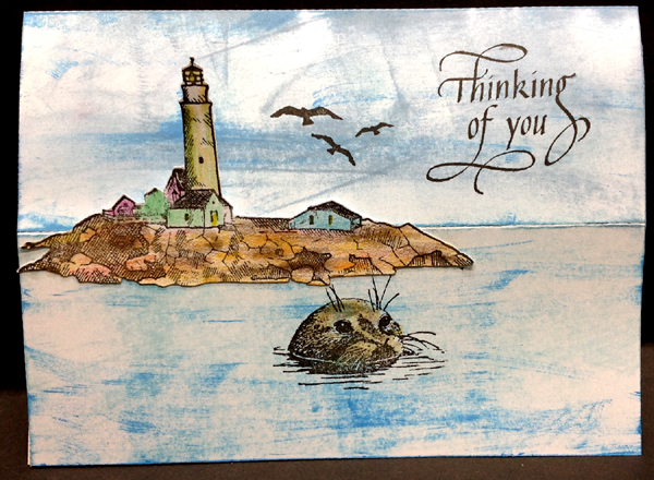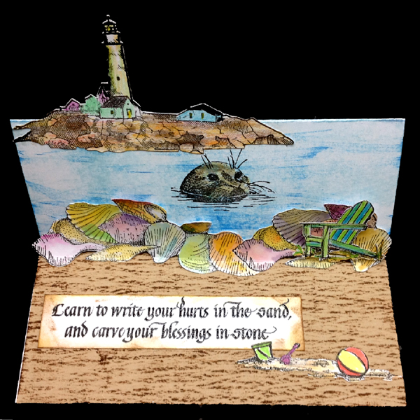 I scored and created my easel from white cardstock. Applied Distress pads direct to paper on the front ("Tumbled Glass", "Salty Ocean" and a bit of "Stormy Sky"). Stamped the otter (Old Island Rubber Stamps) using Versafine "Black Onyx" and colored him a bit with Prisma colored pencils. Stamped the birds and sentiment with the black. Made silhouette images of all the scenic stamps so I could cut them with my electronic cutter. (Lighthouse - Local King Rubber "Still Life"; Seashell border (Evo); Chair & Play Toys - Flourishes "Beach Life"). Cut the silhouettes from white 110# cardstock, then colored either with the Prisma pencils or Peerless watercolors (shells). Adhered the lighthouse only on the bottom edge so it would stand up when easel was formed. Adhered a piece of beige Ruche cardstock on to the floor of the easel which was swiped with "Gathered Twigs" and "Vintage Photo". Adhered my shell border as my stopper. Adhered the chair with 3D foam tape to the shell border. |