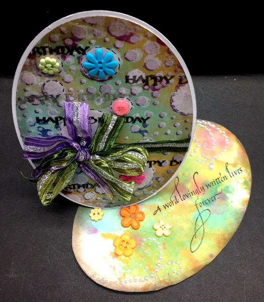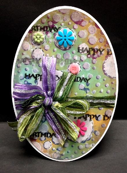 I started by painting the background using Distress paint daubers in similar colors as the video, then working it a bit more with a sponge on 65# Neenah White cardstock. Dried, then started sponging on colors through the 12 x 12" stencil (Prima Marketing). Dried and shifted the stencil applying the Picket Fence dauber. Dried and applied a 2nd layer of the white. Dried, then eCut the oval with my electronic cutter. Also cutting a white shadow layer. Stamped the "Happy Birthday using Versafine "Smokey Grey" and then doing some with "Black Onyx", clear embossing the black ones. Sponged some Distress "Walnut Stain" around the edges. Put the stencil back in place and added some faux stitching around some of the circles using a micron pen. Used the shadow layer to create my oval side easel. Tied a Sari ribbon around my background oval and a multi loop bow - shabby chic style.... Adhered to my shadow layer, then on to my easel. Adhered various colors and shapes of buttons. Covered the floor of the easel with the backside of some scrap paper created when spraying petals with various inks. Same as from when I created this flower card Stamped the quote with the black. Adhered the pearl flourishes and added a few more buttons, a couple of them act as the stopper. |