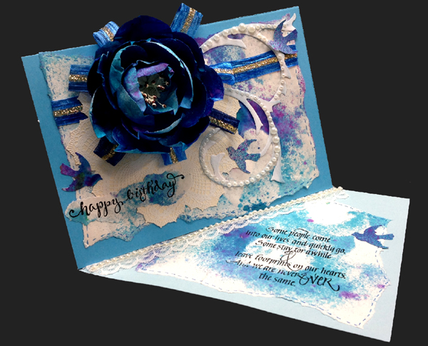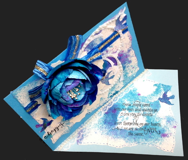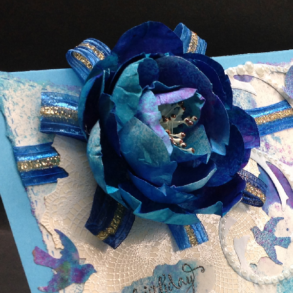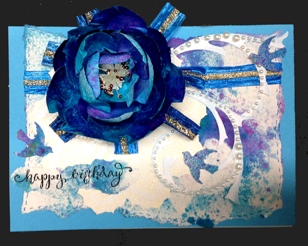 I created my flowers from white 67# cardstock, cutting out the petals free hand with scissors. PS: I always have a calligraphy practice pad under me made from Genoa bond type paper. I sprayed my petals on both sides using Dylusions "Calypso Teal", then gave a light spritz of "Bubblegum Pink" on one side, then a mist of Perfect Pearls "Turquoise". Used the tools below to shape my petals. Adhered the two outer layers of petals to a 1" cardstock circle using my glue gun - and ran out of petals BIG GRIN... so cut a bunch more, but this time sprayed them with a watered down version of the Teal (70%H2º). Continued adhering them to the circle. Also adhered several for the center cluster head. Adhered a quilled fringed white piece, then adhered a bunch of stamens that were white with a brown dot on them. Now the reason I mentioned my calligraphy pad was because I tore off the paper after spraying the petals and the inks seeped through the backside leaving a beautiful background which I tore off and adhered to a piece of aqua blue cardstock. Wrapped a piece of blue Sari ribbon around, then adhered my doily lace which I cut with my electronic cutter from cream toned cardstock, stamped with Stampin Up "Hello Doily" using Versafine "Toffee" and embossing with white embossing powder (so it's hard to see the doily - sorry. I then adhered loops of the Sarin ribbon with my glue gun and then adhered the flower. I scored my light blue cardstock to make my side easel card, then adhered my flower layer. Stamped the "Happy Birthday with Versafine Black Onyx on another piece of the background paper and clear embossed, then tore and adhered to card front. Die cut Sizzix Tim's Flourish from white cardstock, sponging with a dirty blue sponge along the edges only, and cut it apart into two pieces, adhering white half pearls all over the flourish, then adhering it to the card. Added faux stitching with a Distress marker "Salty Ocean". |