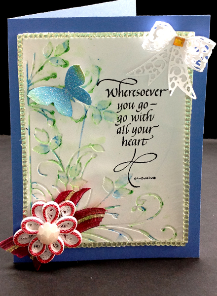 I applied Gelatos to the embossing folder (Aqua, green) misting with water, then placing my white cardstock in the folder and running through my machine. Dried. Side folded my blue cardstock and adhered my embossed piece. Adhered the smoke square shaped rhinestone border (picked up on sale at Michael's yesterday...). Stamped the quote with the black. Adhered the glittered butterfly (from a previous project). The bow is a filigree design I created and then made in to a bow shape using my electronic cutter. Added the amber square rhinestone. The quilled flower is one I made in my quilling session yesterday, crimping the quill strips prior coiling. Added the humungous pearl detail and adhered the flower onto some pieces of red Sari ribbon adhered with a glue gun.