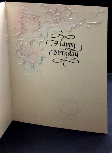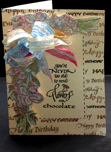 I started by applying Gelatos to the embossing folder (Aqua, Dk Blue & Pink) misting with water, then placing my watercolor paper in the folder and running through my machine. Dried. Then cut around the design. Hit the high points with a Distress pad (Spun Sugar) and embossed with Queen's Gold embossing powder. Side folded my cream toned cardstock. Masked off the central area and stamped the "Happy Birthday" repeatedly using Versafine "Vintage Sepia and hitting it here and there with "Black Soot". Used a Black gel pen to draw in my faux stitching. Stamped my quote/sentiment (part of 1 stamp and a sentiment stamp). Colored the little flower with Prisma colored pencils. Adhered the Garden Spray to card with 3D foam tape. Wrapped my Sari ribbon several times around my hand, then tied a double not to create the fluffy bow. Adhered with a glue gun. On the inside, embossed the design again using the dirty folder, then went over the high points with a dirty blue and pink sponge. Stamped the sentiment with the black. |