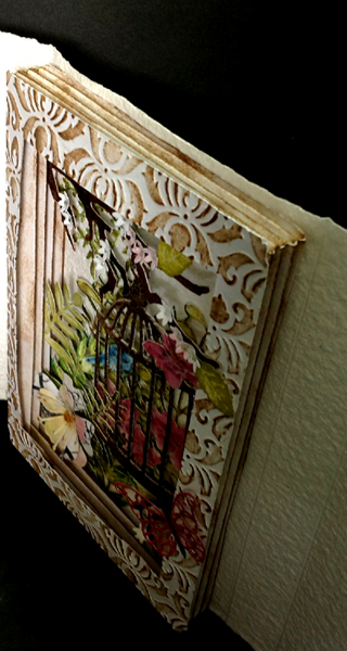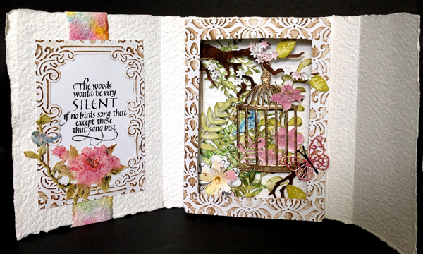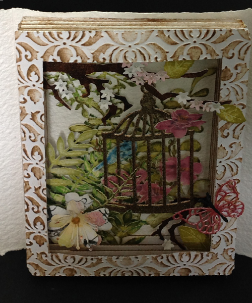 I scored the paper for the cover, then the spine area, the back , another spine height and the flap. I had a left over piece of the paper, so trimmed it down, misted with water and applied Distress Stains ("Mustard Yellow", "Broken China", "Picked Raspberry") all over, misted with more water and dried. I scored it to wrap around my front cover to hold my flap closed and glued it to the inside of the cover. Stamped the sentiment with Versafine Black Onyx and clear embossed. Die cut with Spellbinders Label 22, sponged some brown around the edges and adhered to wrap around. Punched a couple holes and added the pearl brads. Flattened the backs and adhered another piece of cardstock to protect the prongs from being caught by anything. I liked the frame cover I made on the last booklet, so made another one, this time using Cuttlebug Cut Emboss folder "Brocade Window", hit the high points with the brown pad. Cut out the decorative element leaving only a straight border for the frame - the decorative part I used as a frame for my quote. Adhered the accordion part to the card, then adhered the decorative frame to the accordion. Colored white cardstock with various Distress greens and cut out all kinds of leafy greens, adhered them to create depth and a scene. Die cut Tim's "Branched Tree", colored with browns and embossed with Distress embossing powders (Vintage Photo & Walnut Stain). |